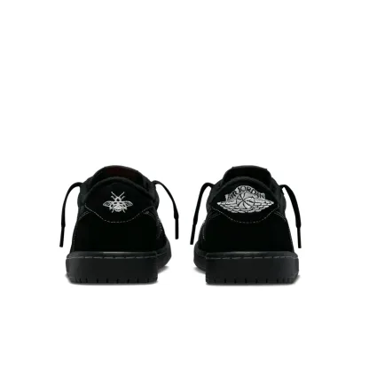Make a bold statement with the Jordan 1 Retro Low OG SP Travis Scott Black Phantom. With careful attention to detail, these eye-catching kicks feature a black nubuck upper, tonal suede overlays, and unique contrast white stitching throughout. This upper is finished off with signature details like the reverse Swoosh on the lateral side, traditional Swoosh on the other side accompanied by Cactus Jack branding plus mismatched heel tabs displaying a retro Wings logo on one and an embroidered bee motif on the other. The low-top style is mounted on a black rubber cupsole with stitched sidewall construction and encapsulated Air-sole cushioning for unbeatable comfort. Take your look to the next level with these standout shoes as part of any ensemble.