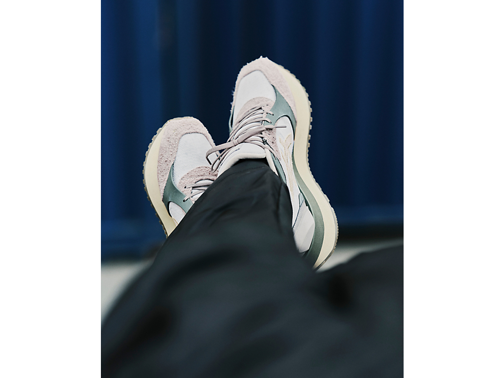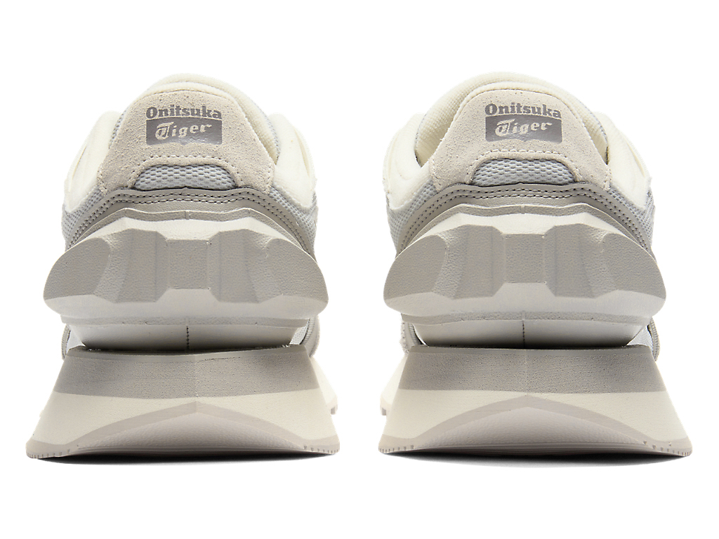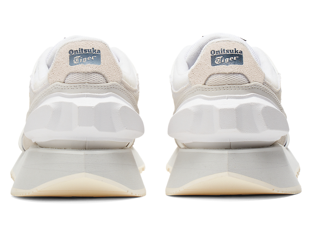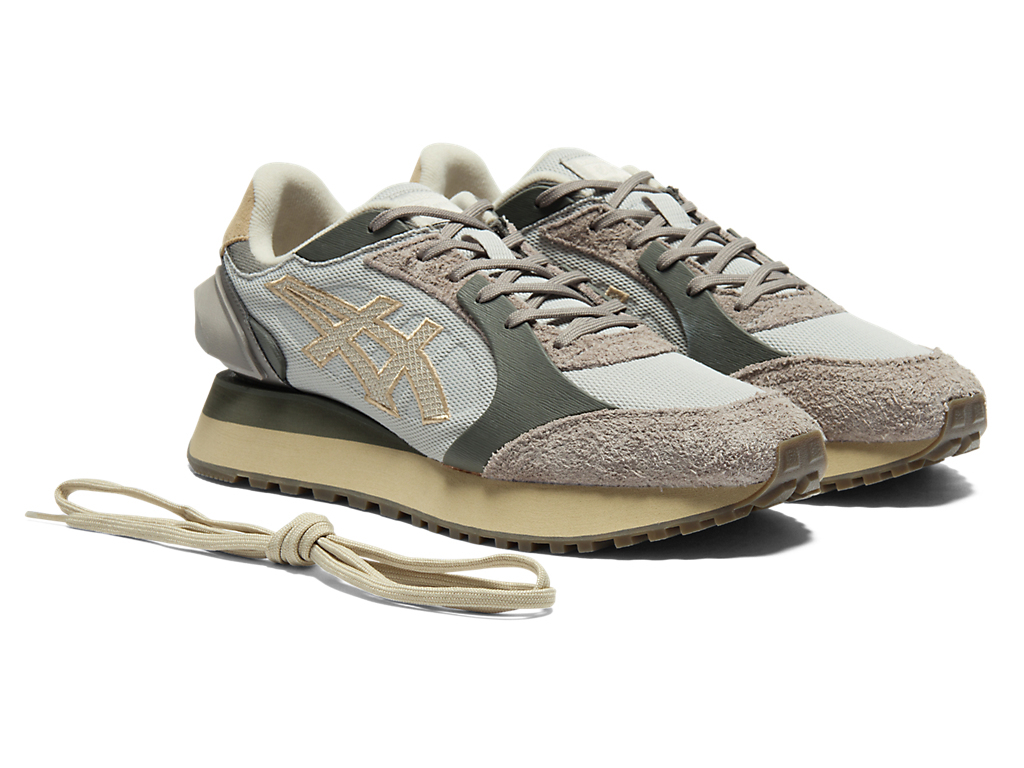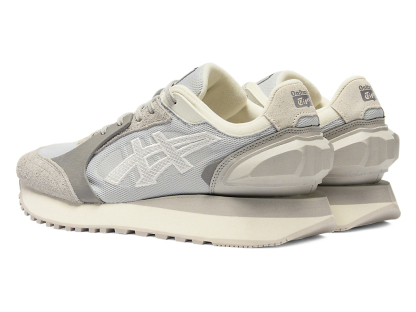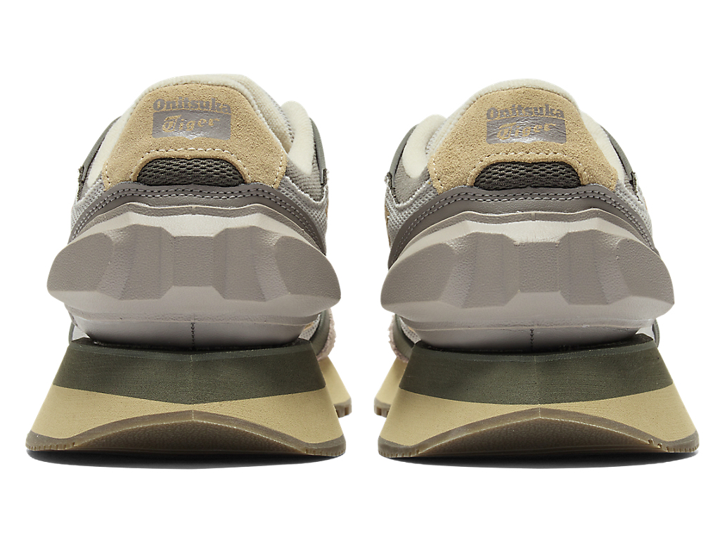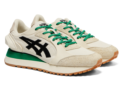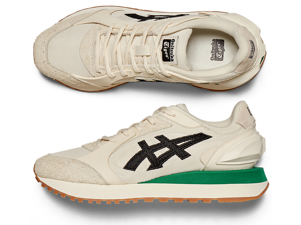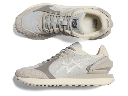1980年代のランニングシューズからインスピレーションを受けたアッパーデザインは、ラバーパーツをはじめとする複数の異素材のレイヤーで構成されており、目の粗いメッシュと刺繍で凹凸感を表現したオニツカタイガーストライプや、大胆な凹凸を表現したかかと部分が特徴。