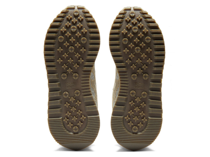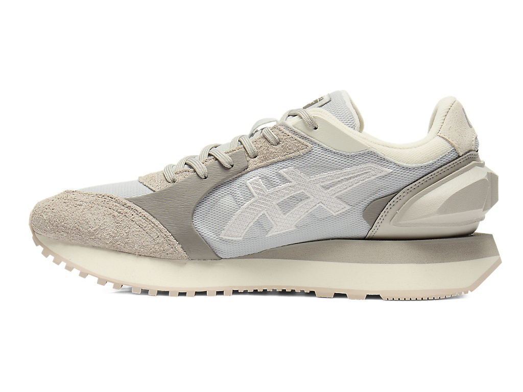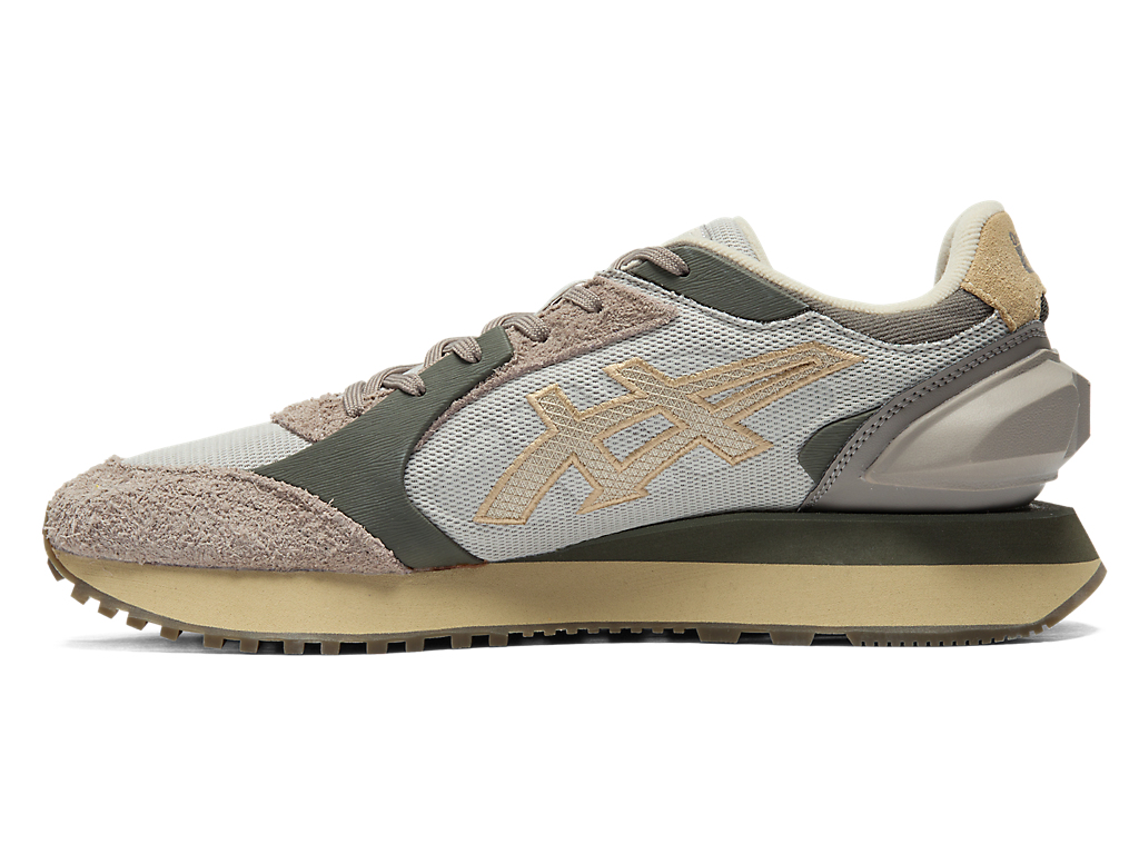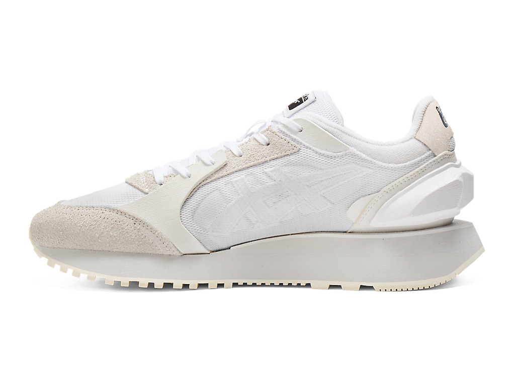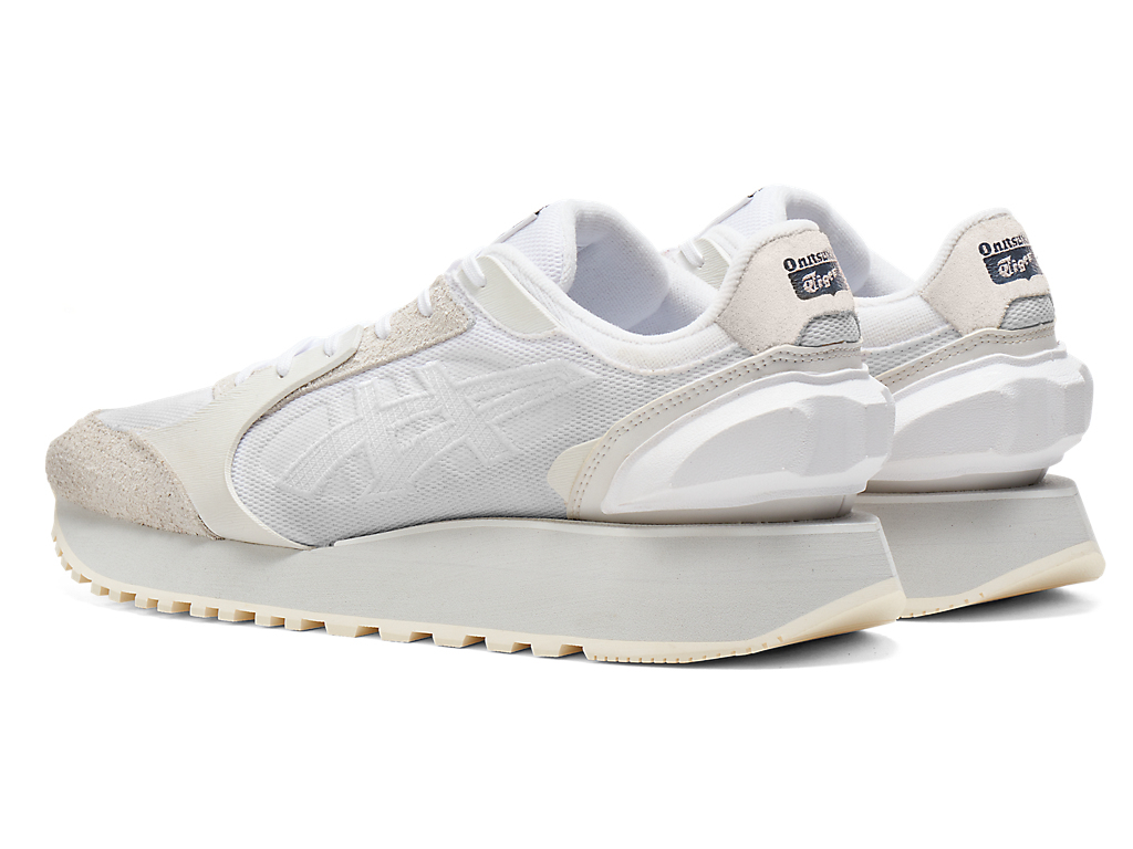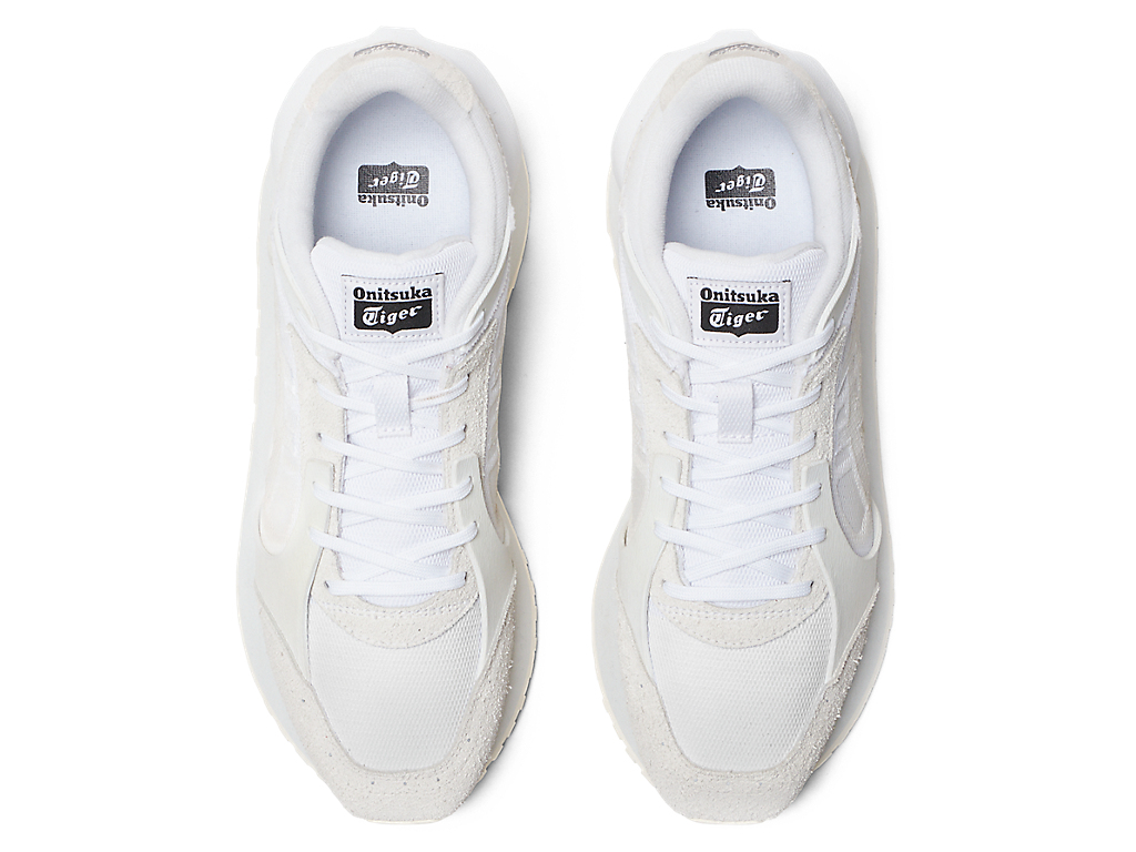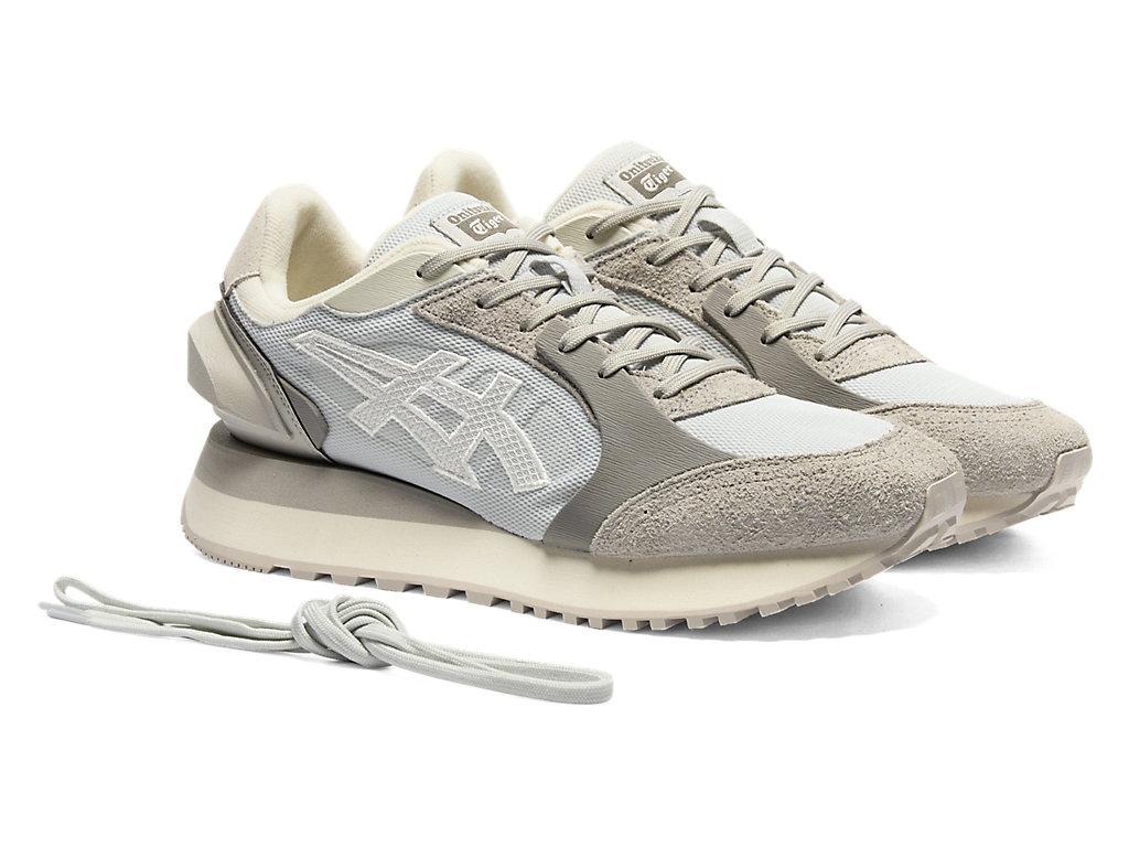 1980年代のランニングシューズからインスピレーションを受けたアッパーデザインは、ラバーパーツをはじめとする複数の異素材のレイヤーで構成されており、目の粗いメッシュと刺繍で凹凸感を表現したオニツカタイガーストライプや、大胆な凹凸を表現したかかと部分が特徴。